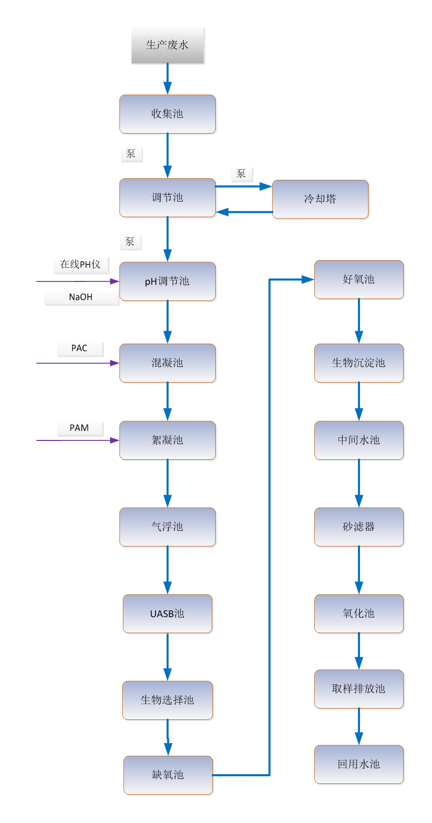 生产废水进入收集池,然后泵入调节池,经调节池调节,均匀水质水量。池内设置温度仪,水温高于40℃将启动提升泵打至冷却塔降温,水温低于40℃则启动提升泵打至pH调节池。然后经过混凝和絮凝处理,再进入气浮池,去除水中细小悬浮物及胶体物质后进入厌氧进水池,厌氧系统采用UASB反应器。出水进入生物选择池、缺氧池及后端好氧池,能有效去除COD和氨氮。缺氧池出水自流到好氧池,经过生化沉淀池泥水分离,上清液进入中间水池,经砂滤器过滤进一步去除悬浮物,然后进入氧化池,氧化池设置活性炭填料并通入臭氧,保证终出水水质。氧化池出水流入取样排放池和回用水池,设置回用水泵将水输送至用水点。