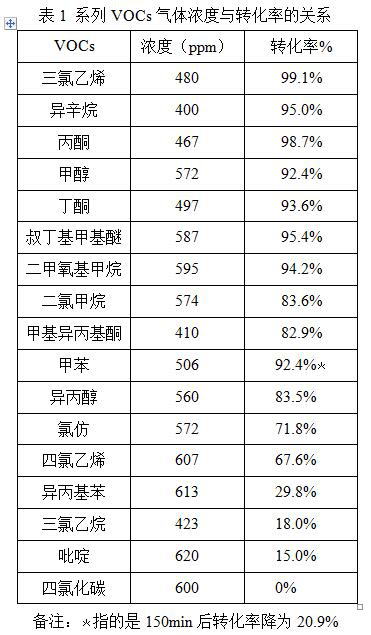 从表1VOCs浓度和转化率数据可知:在相同测试条件下,在VOCs浓度400-600ppm区间内,大多数VOCs气体具有较高转化率。然而,光催化降解异丙基苯、三氯乙烷、吡啶和四氯化碳的效率是不明显的。